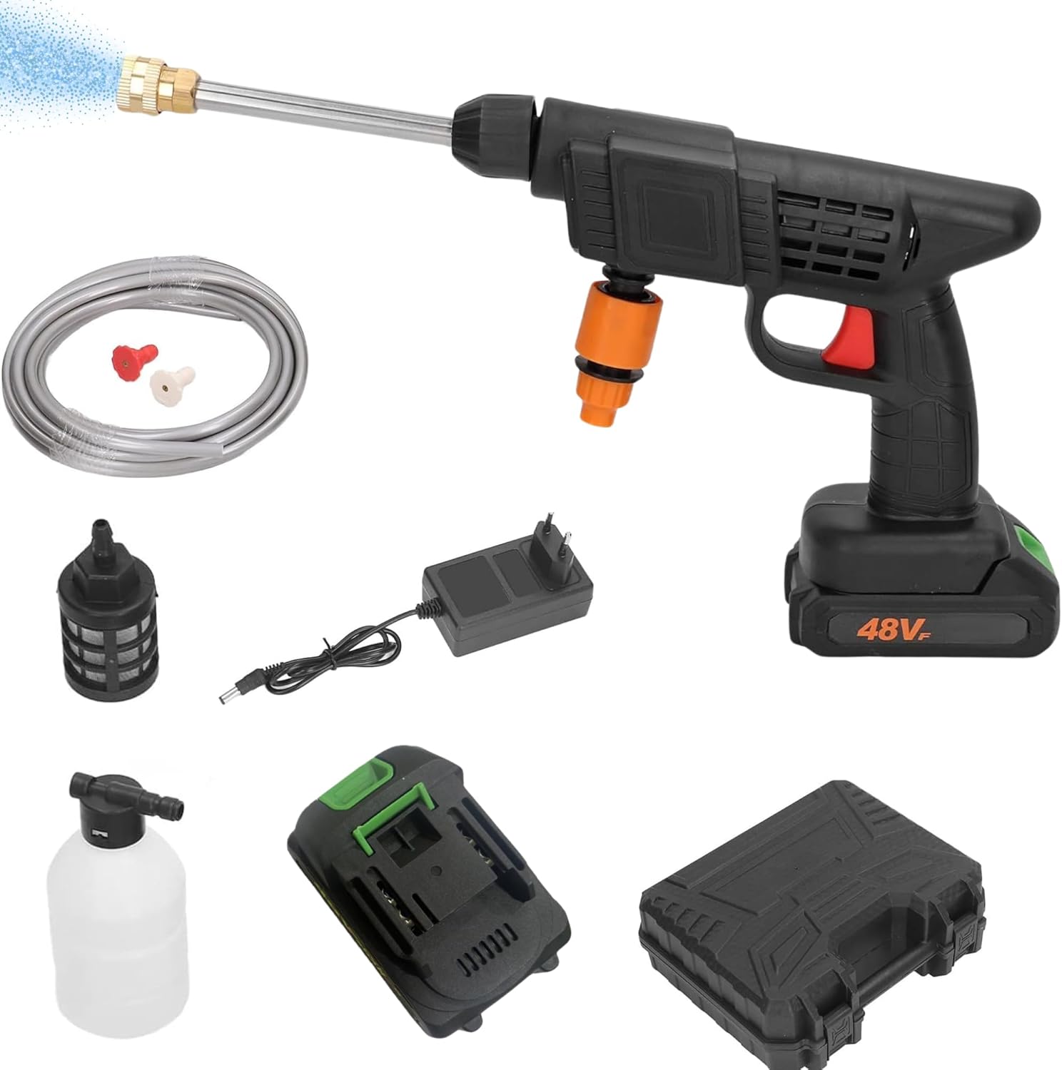 Superior Battery Performance: Equipped with a durable 48V lithium-ion battery, our high-pressure water sprayer provides up to 40 minutes of wireless use on a single charge, and with two batteries, you can enjoy up to 80 minutes of continuous use. The battery is protected by a special circuit chip to prevent overcharging, over-discharging, and short-circuiting, ensuring long-lasting reliability.