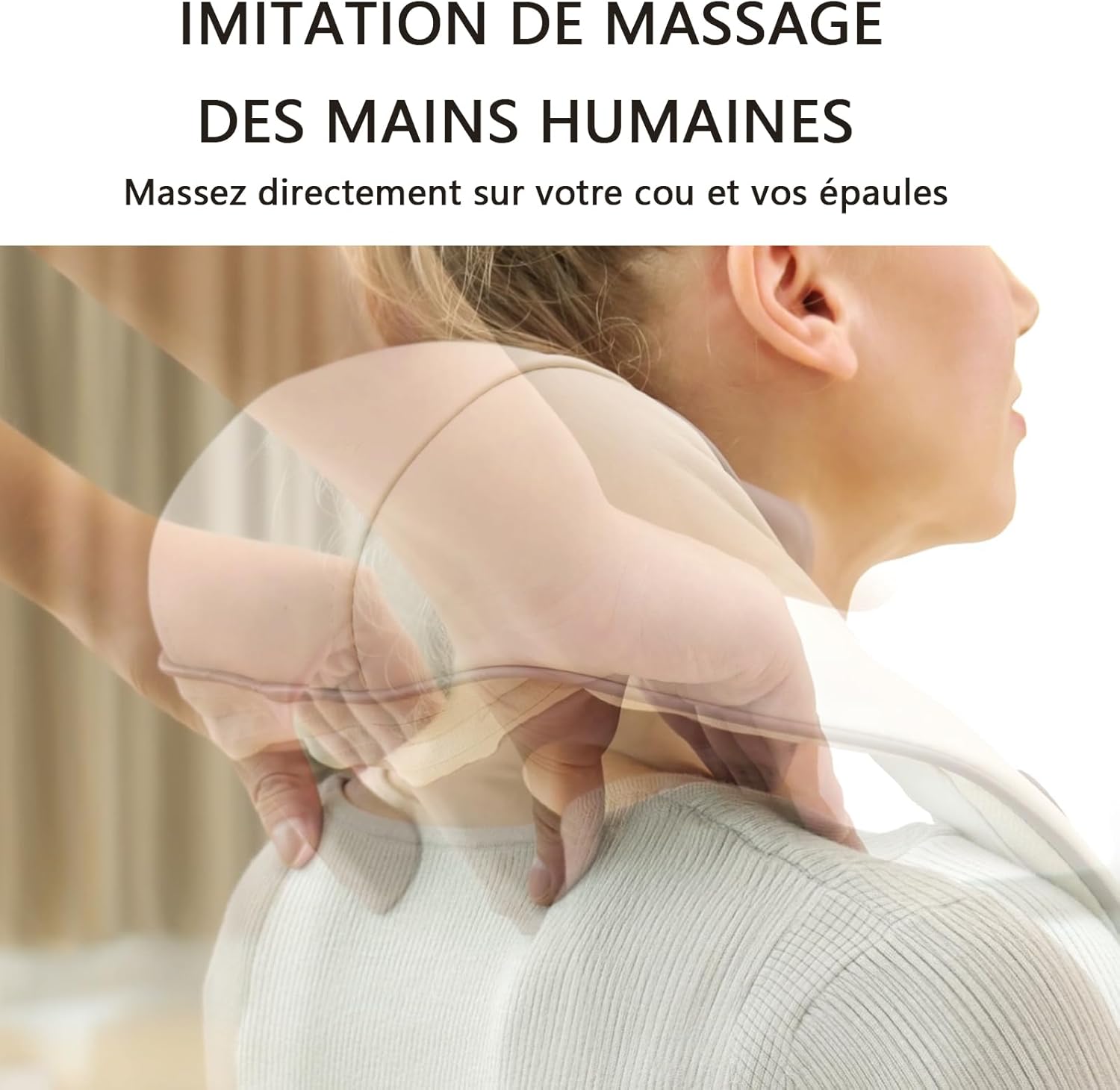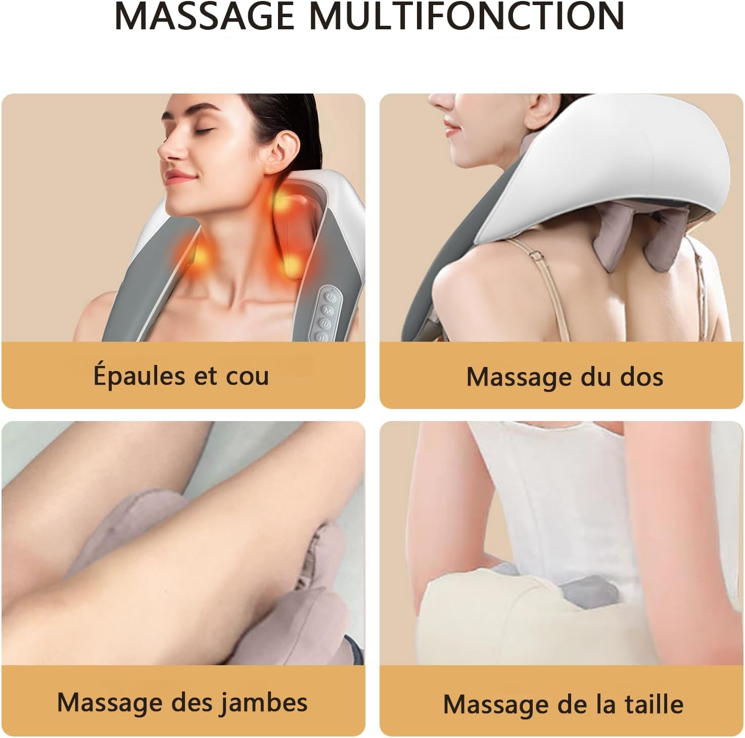 The neck massager includes a heat option with two adjustable heat compress settings (104°F/111°F) to enhance relaxation and alleviate tension. It automatically shuts off after 10 minutes to prevent overheating, ensuring safe and comfortable use, even if you fall asleep during the massage.